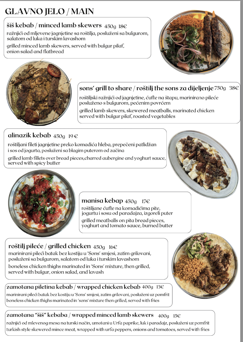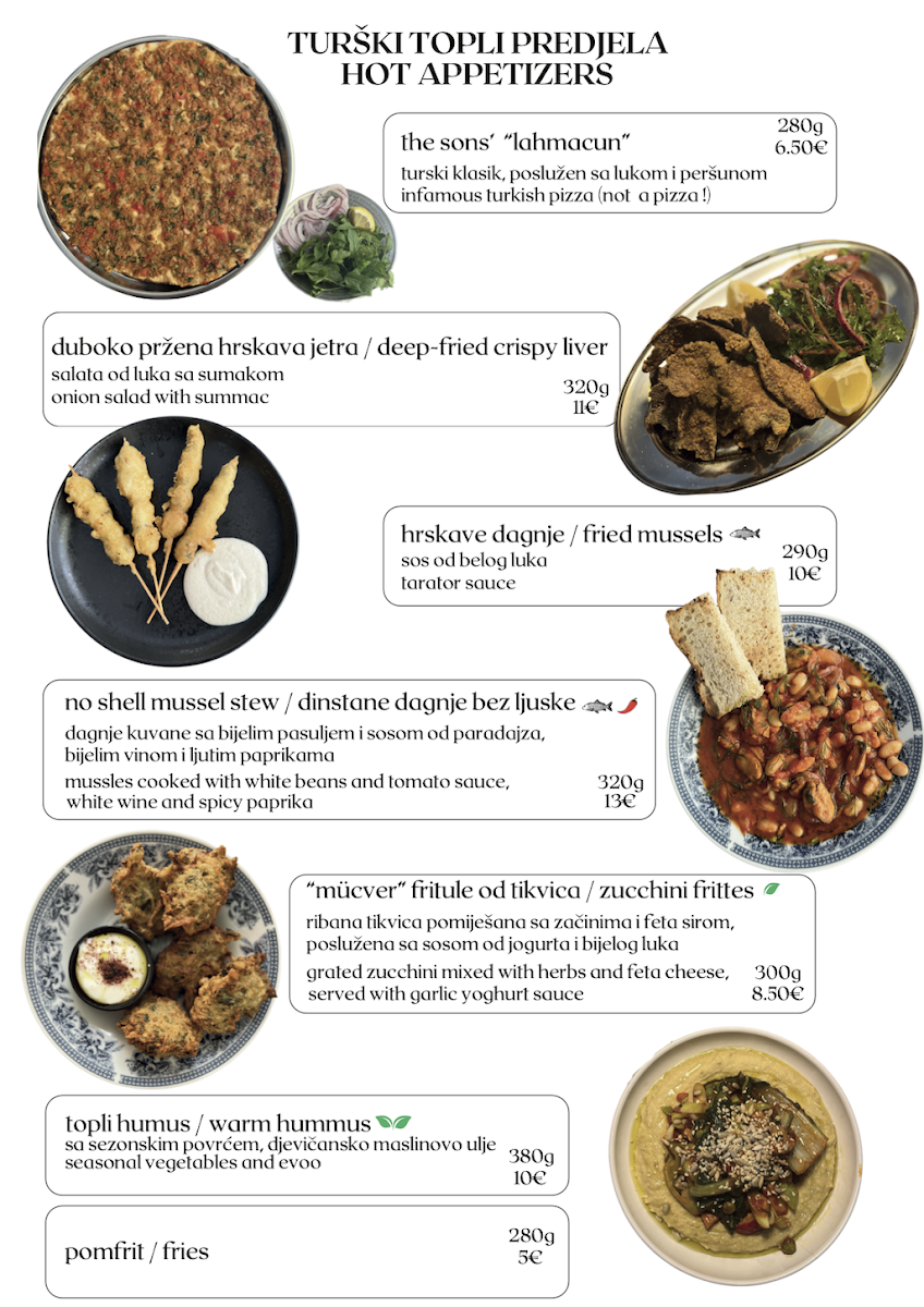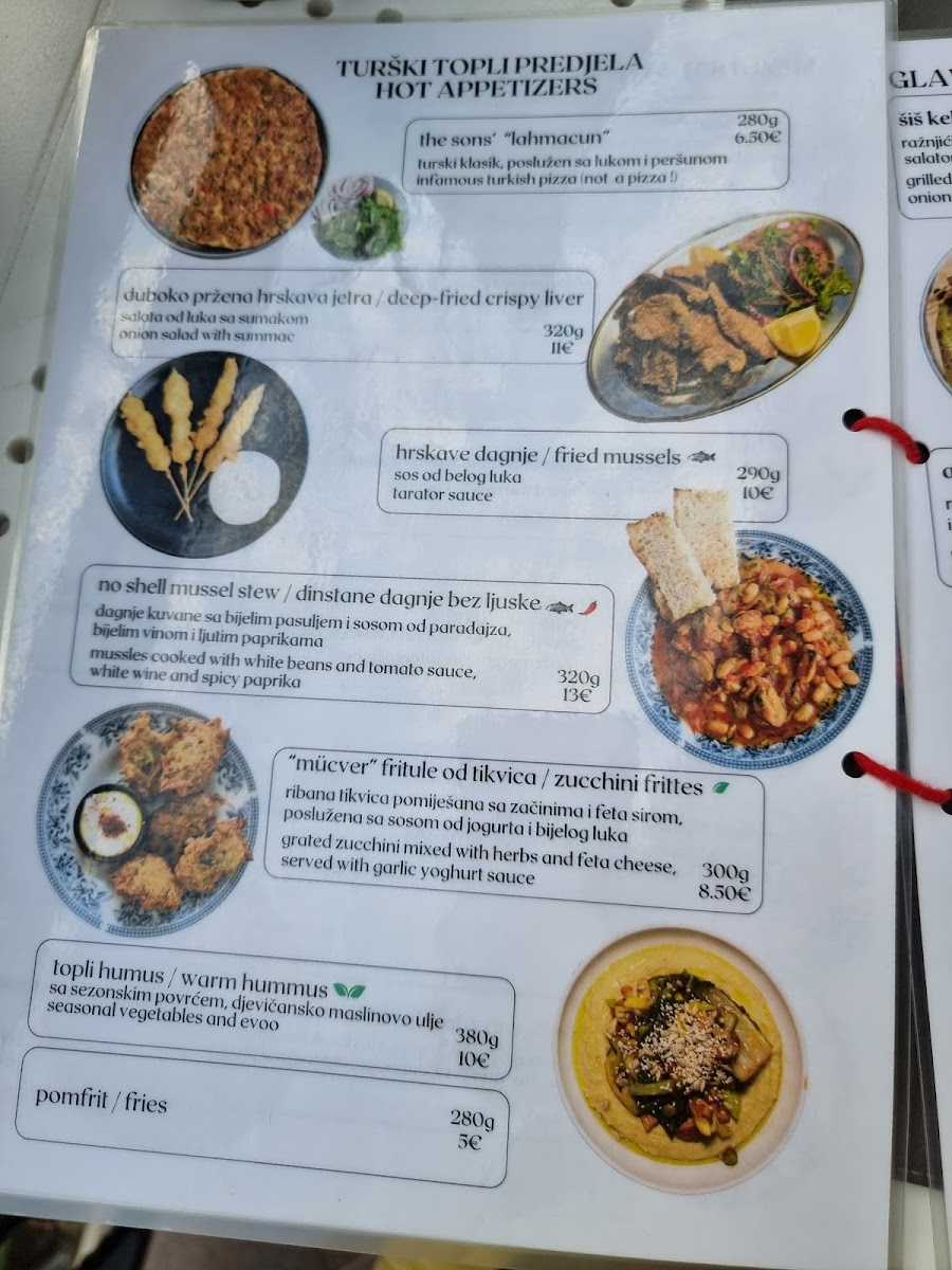 The menu at The Sons Eatery offers a delightful blend of traditional and creative dishes, catering to diverse tastes while maintaining a focus on local flavors. One standout is the Tiramisu, a rich and velvety dessert that perfectly balances sweetness and texture. For those craving something spicy, the Diabolical Chilli Pizza delivers a fiery kick with its bold combination of ingredients. The restaurant’s signature Home-Made Sausage is a must-try, offering a savory, juicy experience that pairs well with a cold drink. A nod to Turkish cuisine, the Turkish Pizza provides a unique twist on the classic with its delicate, thin crust and flavorful toppings. To complement your meal, the Local Kafa is an aromatic coffee that highlights the region’s love for rich brews, while the Кофе offers a more traditional coffee experience. Don't miss out on the Pillowy Turkish Fries Dough, which delivers a soft, doughy delight with a light crunch, or the comforting Turkish Tea, perfect for winding down after your meal. Overall, The Sons Eatery’s menu provides a satisfying mix of hearty, flavorful dishes and refreshing drinks, making it an ideal spot for anyone looking to experience the best of Montenegro’s local and Turkish-inspired cuisine.