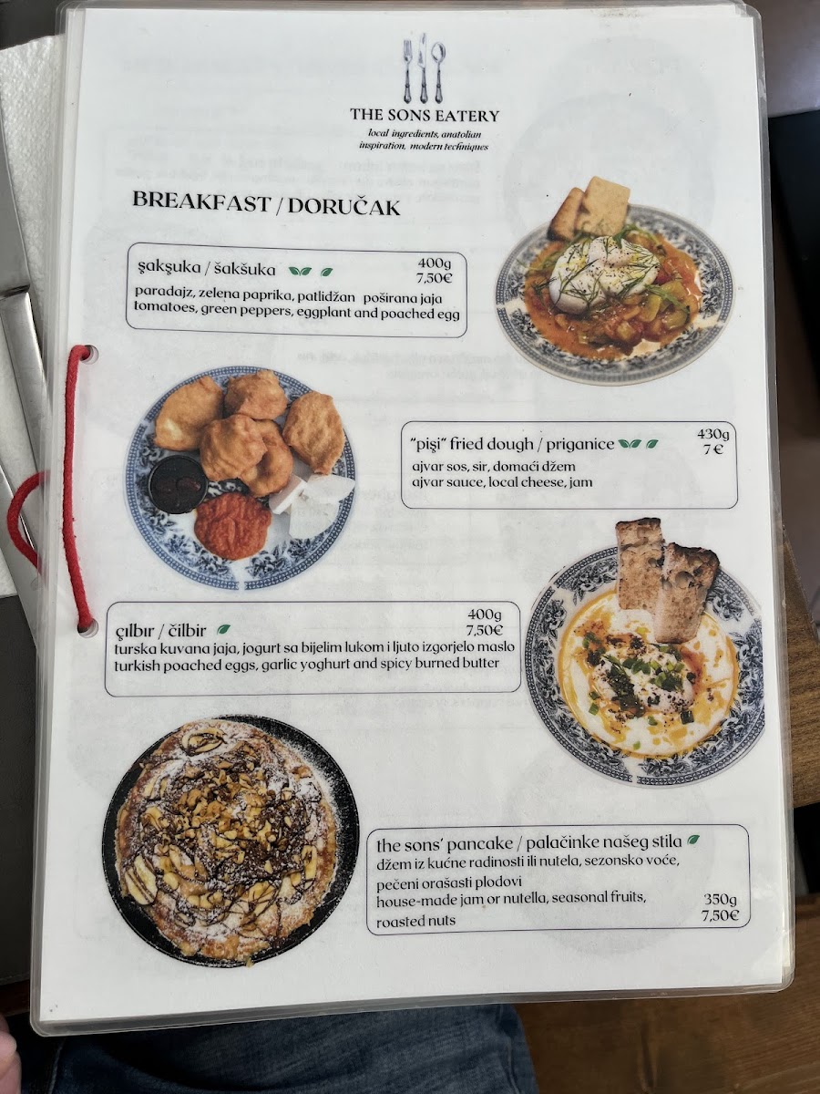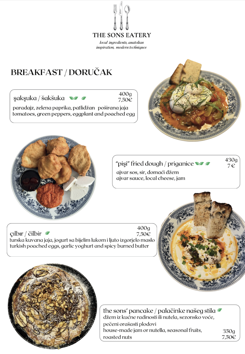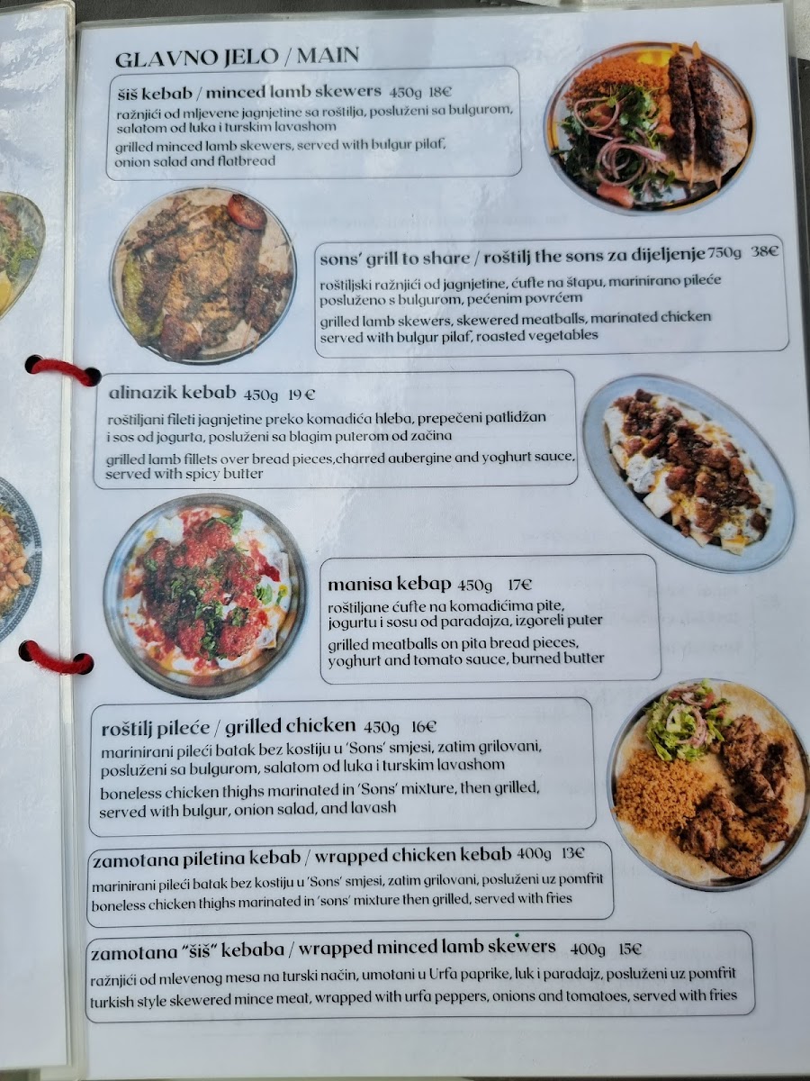 The menu at The Sons Eatery offers a delightful blend of traditional and creative dishes, catering to diverse tastes while maintaining a focus on local flavors. One standout is the Tiramisu, a rich and velvety dessert that perfectly balances sweetness and texture. For those craving something spicy, the Diabolical Chilli Pizza delivers a fiery kick with its bold combination of ingredients. The restaurant’s signature Home-Made Sausage is a must-try, offering a savory, juicy experience that pairs well with a cold drink. A nod to Turkish cuisine, the Turkish Pizza provides a unique twist on the classic with its delicate, thin crust and flavorful toppings. To complement your meal, the Local Kafa is an aromatic coffee that highlights the region’s love for rich brews, while the Кофе offers a more traditional coffee experience. Don't miss out on the Pillowy Turkish Fries Dough, which delivers a soft, doughy delight with a light crunch, or the comforting Turkish Tea, perfect for winding down after your meal. Overall, The Sons Eatery’s menu provides a satisfying mix of hearty, flavorful dishes and refreshing drinks, making it an ideal spot for anyone looking to experience the best of Montenegro’s local and Turkish-inspired cuisine.